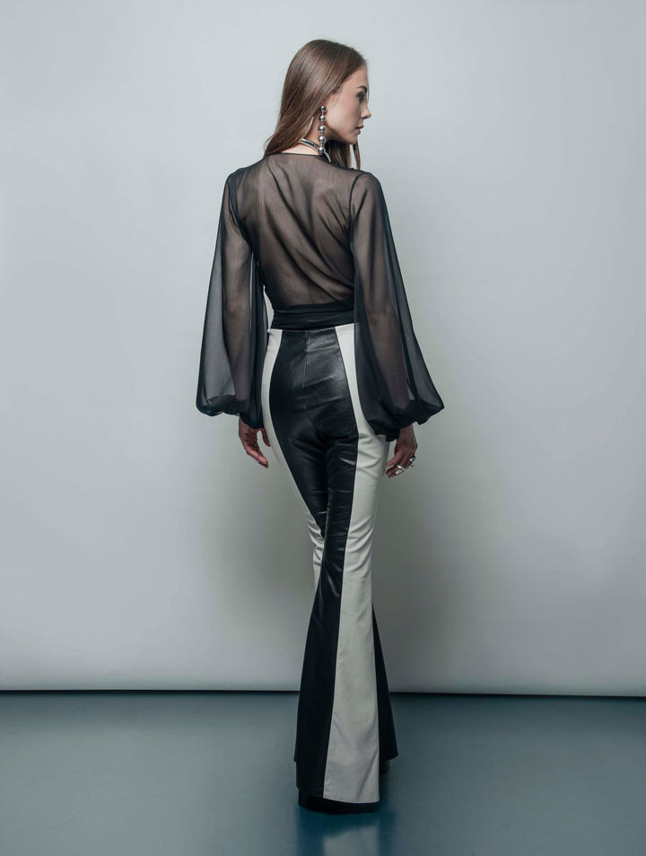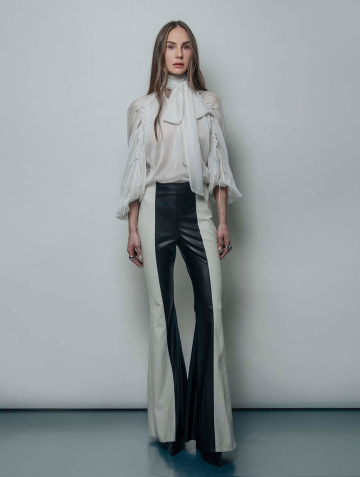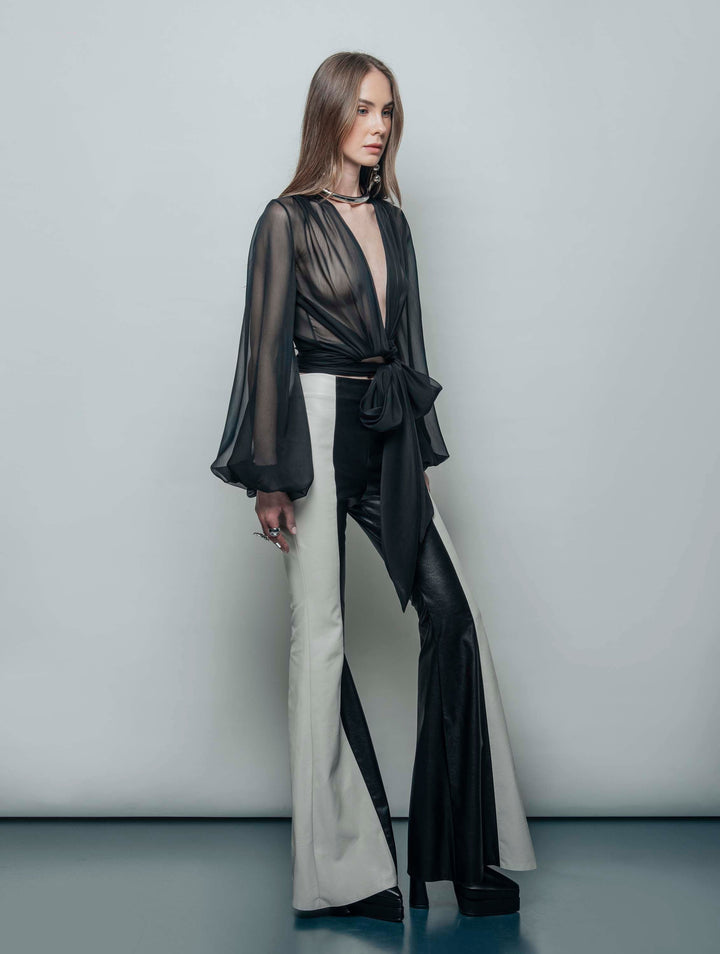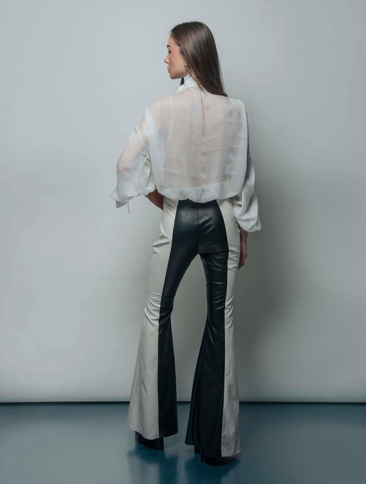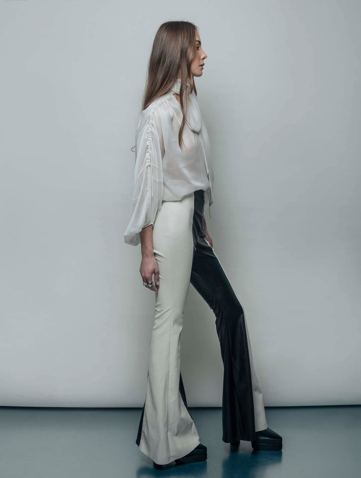 RUSSO. Bi color High-waisted Flare Pants, infused with a bold ‘70s influence. Sculpting a sleek, elongated silhouette from waist to knee, they strike the perfect balance with a fluid, wide-flared hem that adds both movement and structure. A tribute ode to retro style, encapsulating our untamed and unapologetically feminine essence